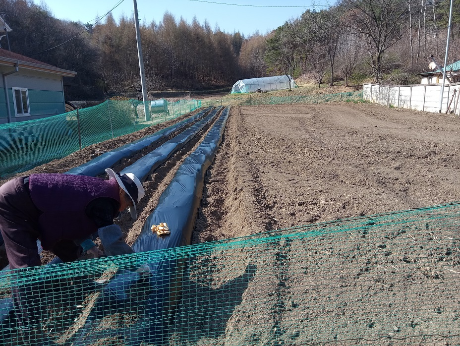 텃밭에 3고랑을 만들어 비닐멀칭을 하고 울타리망을 친 후,